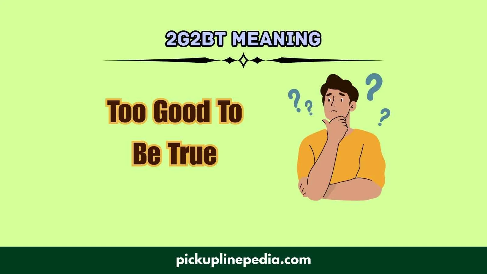 With the rise of internet culture in the early 2000s, phrases began evolving into shorter forms. Just like “LOL” for laugh out loud, “2G2BT” became shorthand for Too Good To Be True.