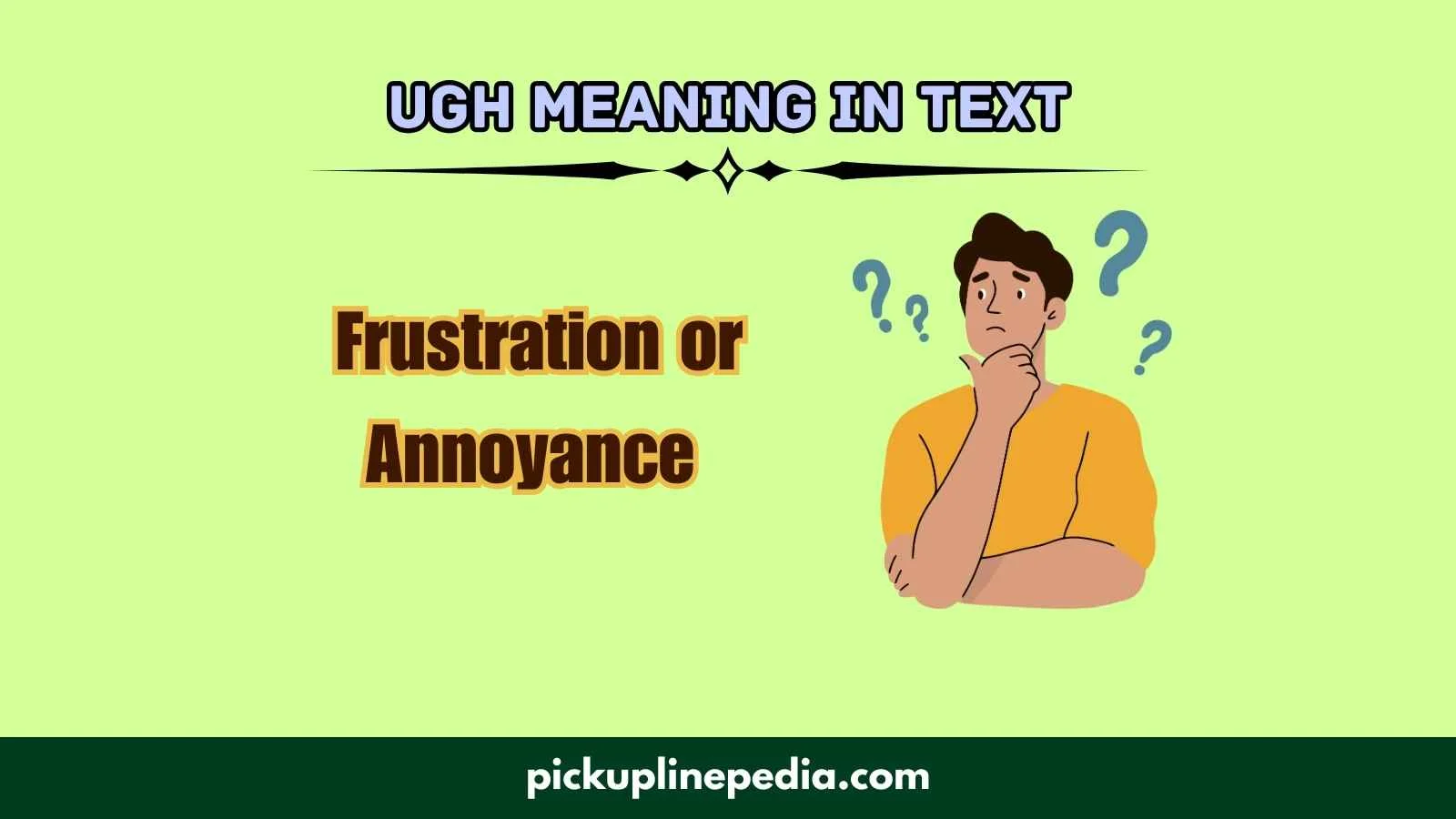 In texting and online communication, “ugh” is an informal expression used to show frustration, annoyance, disappointment, disgust, or emotional exhaustion. It is not an acronym. Instead, it is a sound-based expression (an interjection) that imitates a groan.