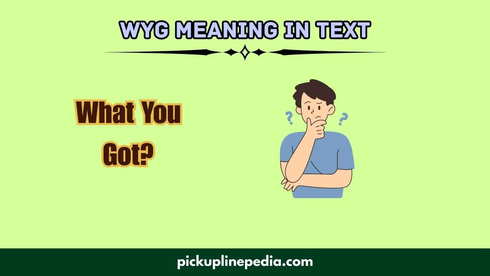 There are no widely recognized hidden or offensive meanings of WYG. Context is essential, though—if paired with aggressive or sarcastic language, it could take on a negative tone. Generally, it is safe for casual messaging.